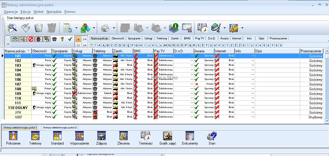 Kontrola statusu pokoju (remont, sprzątanie etc.).