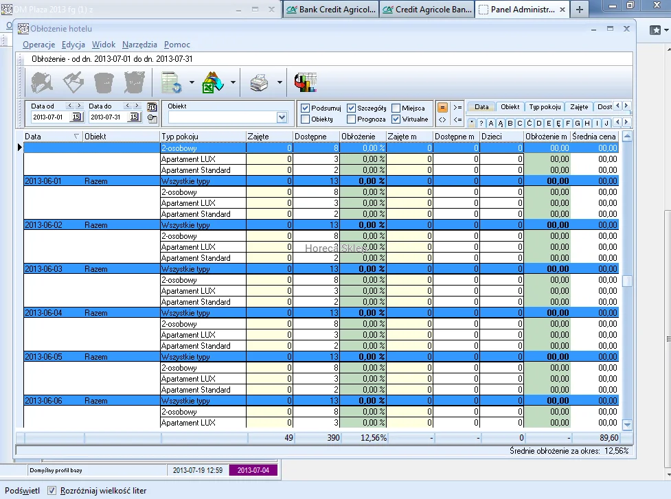 Zestawienie pokoi i miejsc zajętych, wolnych, zarezerwowanych w podanym dniu lub okresie.